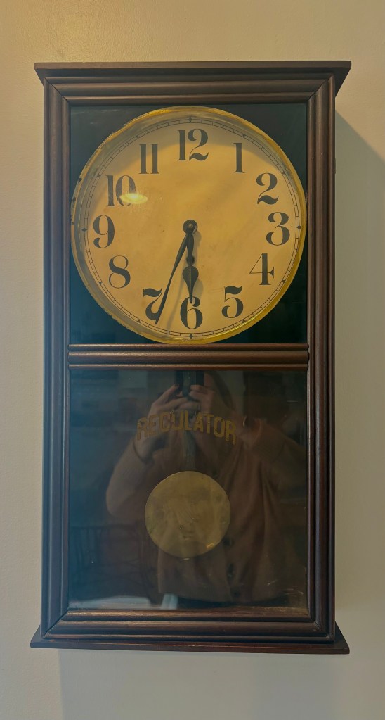 Recently my niece posted a photo celebrating her baby’s first birthday. He’s adorable, front and center grinning in his festooned highchair. Getting to glimpse my great-nephew on his first birthday is one of the truly wonderful things about social media. As I often do, I looked behind the scenes of the photo and it was the background that really caught my eye. Hanging on the wall in my niece’s kitchen is the antique Regulator Clock that hung in the kitchen in our family home for decades. Seeing it there, again, was a little like running into an old friend.